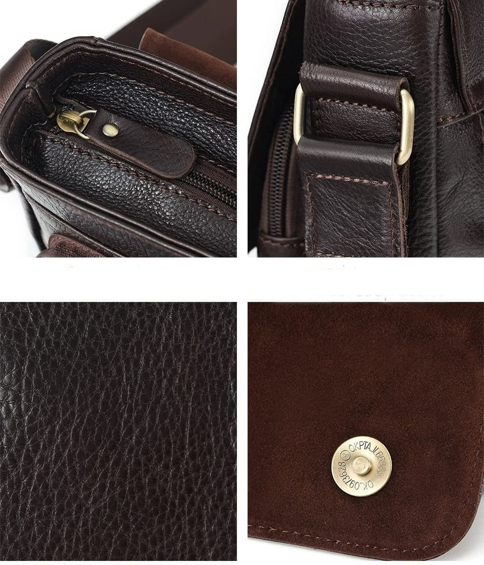 A bolsa apresenta design mini carteiro, com linhas retas e acabamento cuidadoso em couro legítimo, visível na textura natural do material. O fechamento frontal com aba e botão magnético facilita o acesso rápido, enquanto o zíper superior adiciona segurança ao compartimento principal.