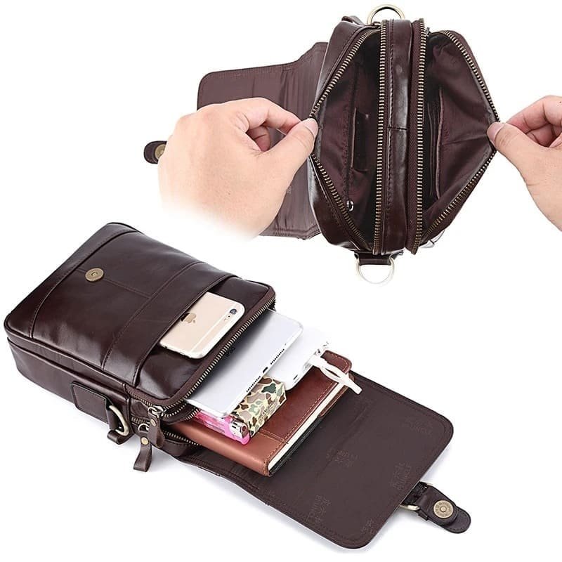 Esta bolsa tiracolo masculina é produzida em couro legítimo, com textura natural visível, acabamento reforçado e costuras bem definidas. O design combina linhas clássicas com detalhes metálicos em tom envelhecido, resultando em uma peça discreta e elegante.