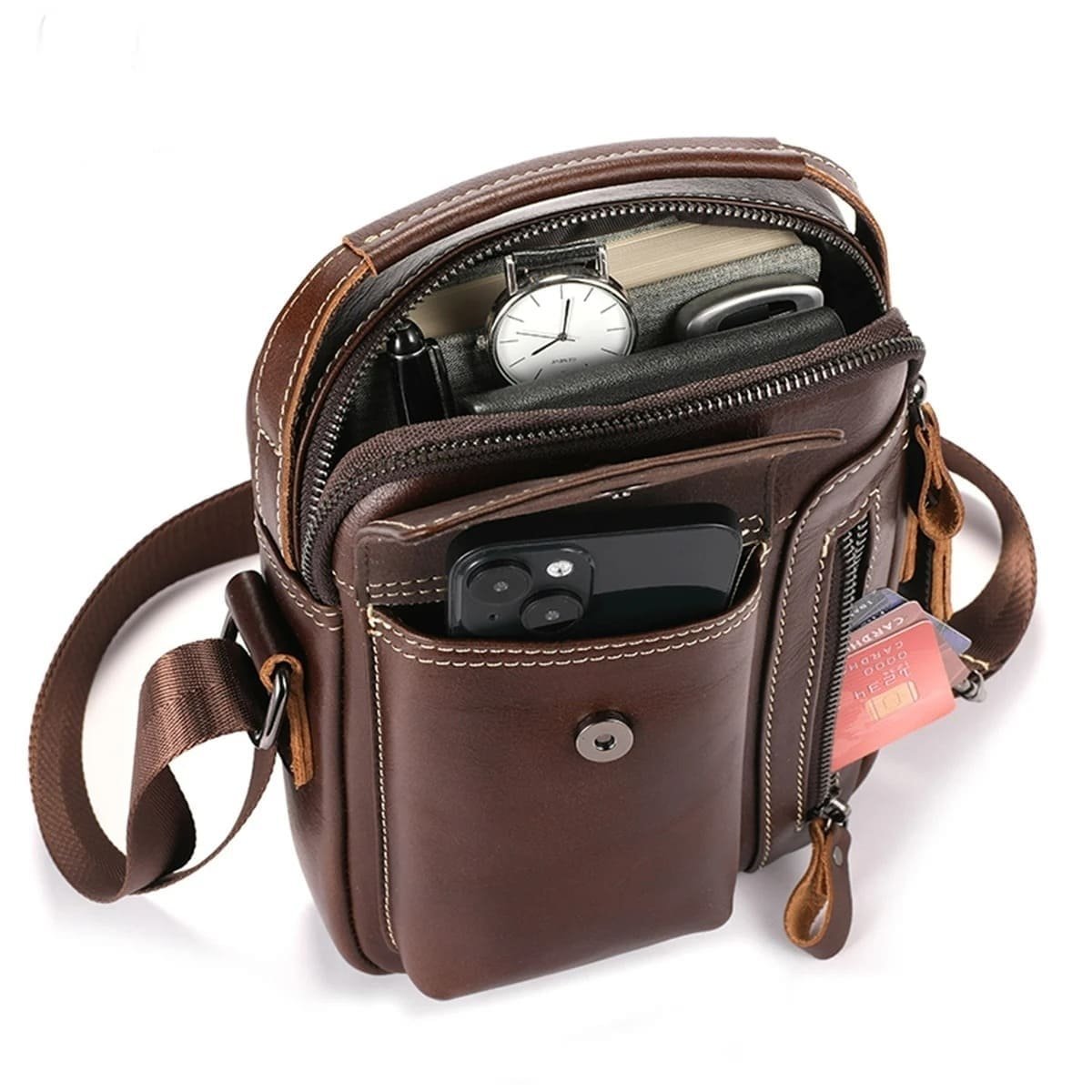 Seu tamanho é ideal para acomodar o essencial com estilo – carteira, celular, chaves, tablet pequeno ou caderno, tudo bem organizado. É a escolha certa para homens que valorizam praticidade sem abrir mão da elegância.