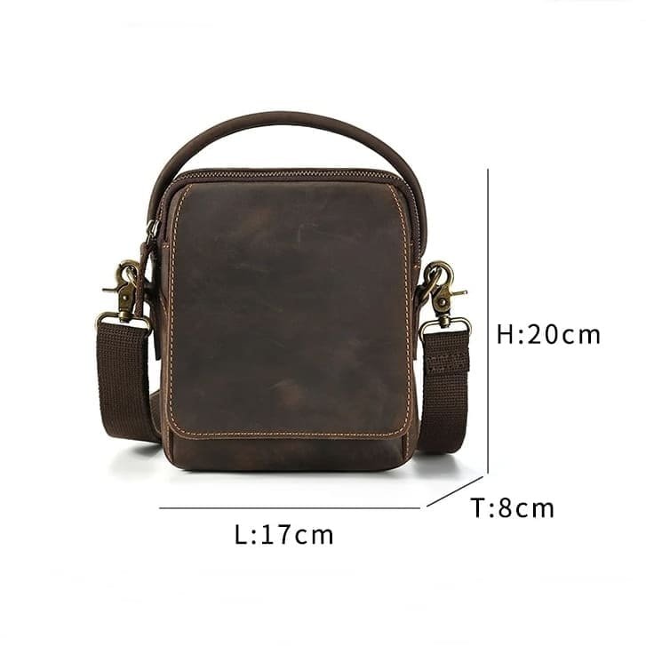 Especificações técnicas da bolsa transversal de couro masculina