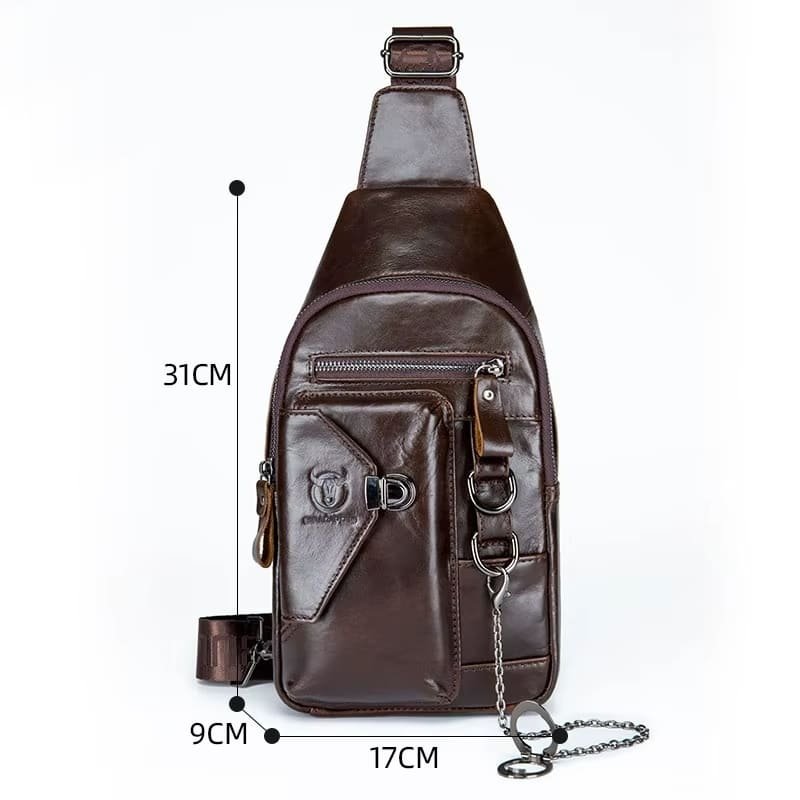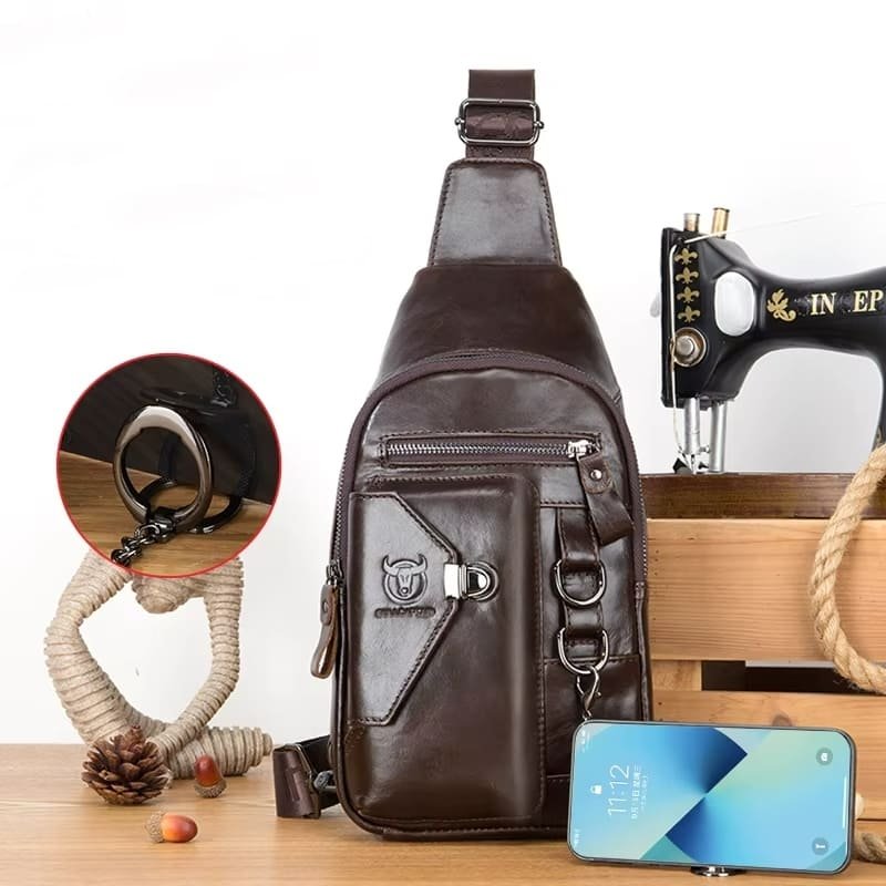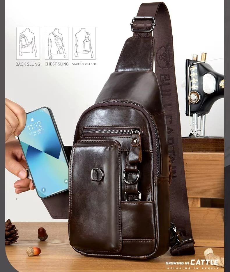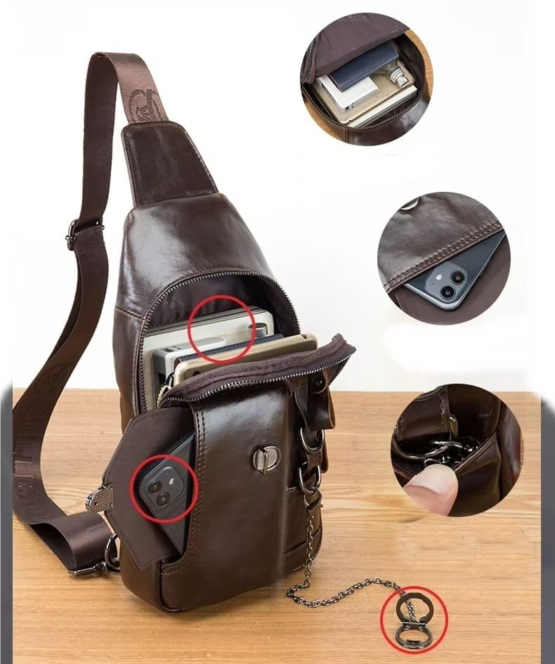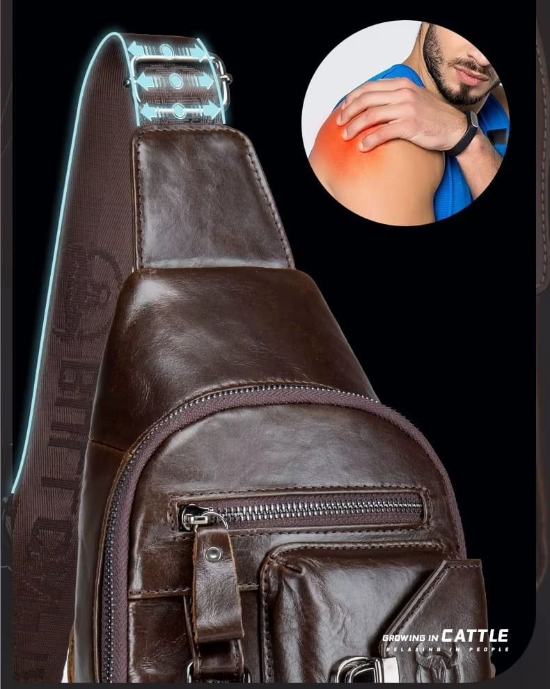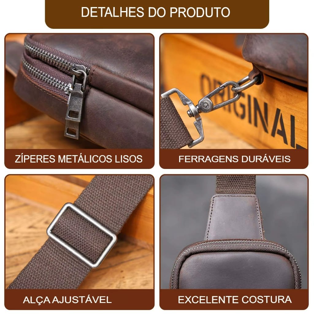 O acabamento em couro legítimo confere resistência e um visual sofisticado, enquanto as ferragens metálicas reforçam a durabilidade e o estilo urbano da peça. A alça larga e ajustável contribui para um encaixe firme e confortável, distribuindo melhor o peso durante o uso.